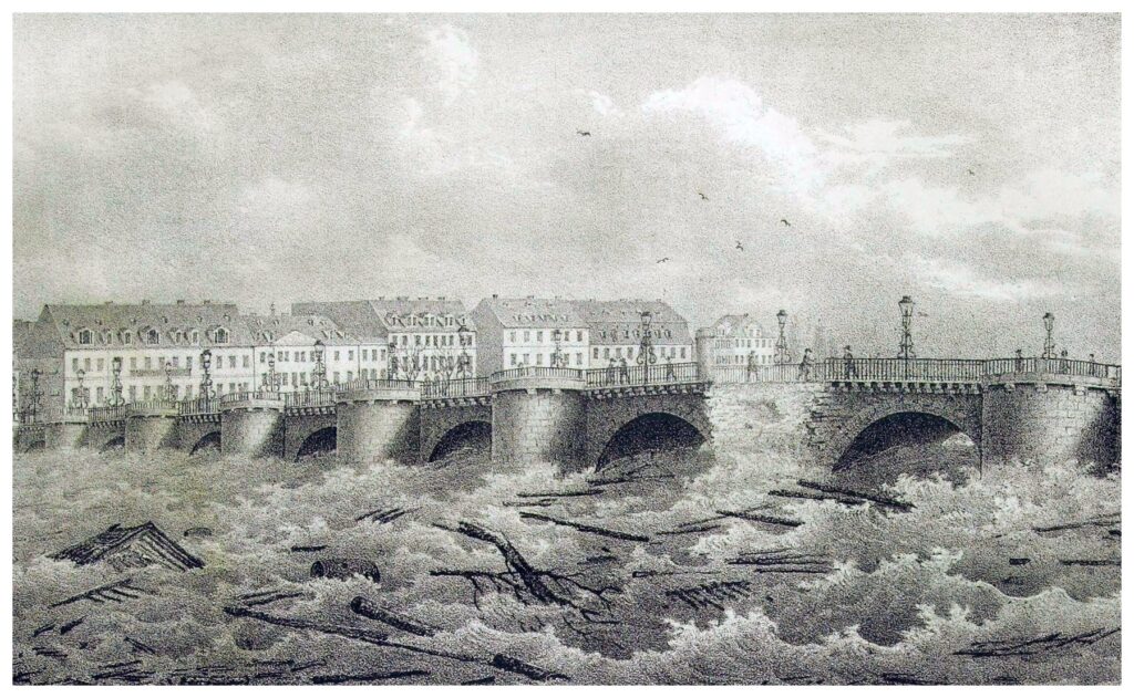 1845 zerstörte ein Hochwasser einen Pfeiler der Augustusbrücke.